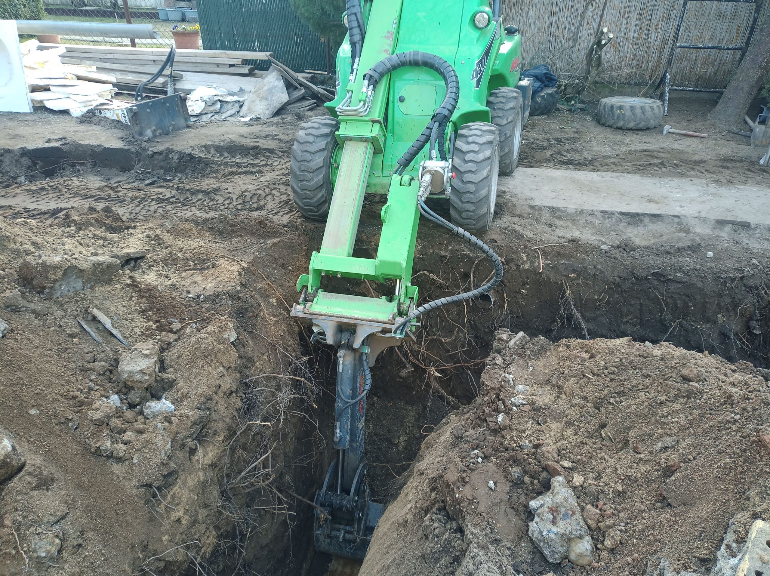Az árokásó adapterrel elsősorban kisebb volumenű munkákat lehet elvégezni. Maximális munkamélysége 1,5m, 25 és 45 cm-es kanállal szerelhető. Legfőbb előnye, hogy kis tömege és mérete miatt könnyen szállítható és rendkívül sokoldalúan alkalmazható, így például a kertépítés során felmerülő árokásási feladatok (támfalak sávalapja, öntözőrendszer nyomvonalának kiásása. Kötött, sziklás talajon gyakori jelenség, hogy a kézi erővel kiásott nyomvonal nem éri el a kívánt mélységet, így növelve a későbbi munkák során bekövetkező sérülés kockázatát. Emellett alkalmas szennyvíz és esővíz elvezető csatorna, víz- és gázvezeték, földkábel árkának kiásására, valamint szikkasztó, vízóra akna szivattyúház munkagödrének kiemelésére. Nagyobb méretű növények ültetésekor is nélkülözhetetlen. A megfelelő méretű ültetőgödör kialakításával, elegendő szervestrágya, tőzeg és termőréteg feltöltésével biztosítani tudjuk az optimális begyökeresedést, intenzívebb hajtásnövekedést.